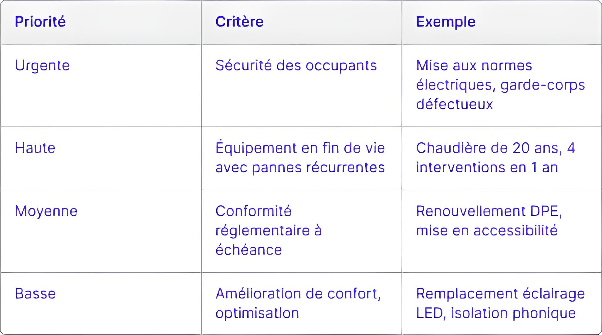 Tous les travaux ne se valent pas. Le PPT classe chaque intervention selon son niveau de priorité :
